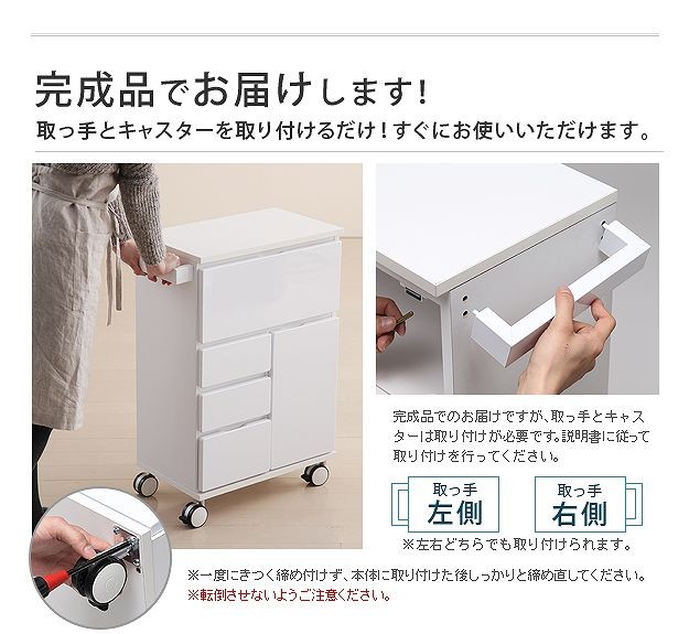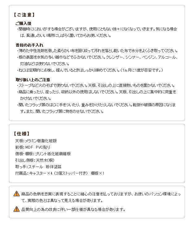 材質:天板-メラミン樹脂化粧板、前板-繊維板(PVC真空プレス)、側板・棚板-プリント紙化粧板、取っ手-スチール(粉体塗装)