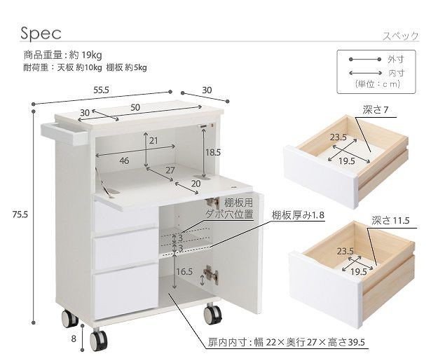 サイズ(cm):幅55.5x奥行30x高さ75.5(キャスター含む)cm・約19kg