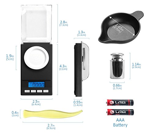 - 100% Satisfaction Guarantee: 2 x AAA batteries, 1 x Tweezers, 1 x Calibration Weight and 1 x Weighing Pan