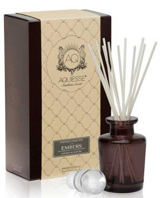 EMBERS REED DIFFUSER Portfolio Collection Gift Boxed by Aquiesse EMBERS - No. 030 - Indian Saffron, Cardamon, English Leather, Tobacco, Olibanum & Musk AQUIESSE REED DIFFUSERS feature 9.5 fluid ounces of fragrance A dozen natural reeds 9 inches long Smoked Glass Stoppered Vessel – 4.5 inches tall x 3 inches in diameter Fragrance lasts 3 to 6 months AQUIESSE defines sophisticated, indulgent ambiance by inspiring the emotions evoked through the bounties of nature. Our fragrances are meticulously blended by master perfumers using the world's finest essential oils and extracts. AQUIESSE products are proudly made in America!