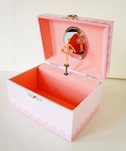 Mirror under lid. -Open storage on top. -MDF cardboard box covered with fashion paper overlay. - Shiny glitter on ballerinas' dress - Charming ballerina doll twirls to "waltz of the flowers". Size: 6 x 4.3 x 3.3 inch sizes / 15 x 11 x 8.5 cm. NIDEC SANKYO musical movement. This box is not solid wood type, decorated paper on MDF base(a type of hardboard, which is made from wood fibres).