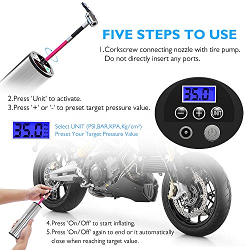 AUTO-OFF TO PROTECT THE TIRE-set the desired pressure and the air compressor automatically shuts off when that pressure is reached. This multifunctional electric air pump also can monitor the air pressure.