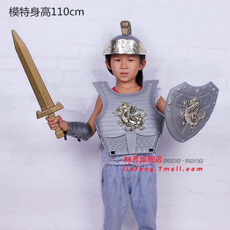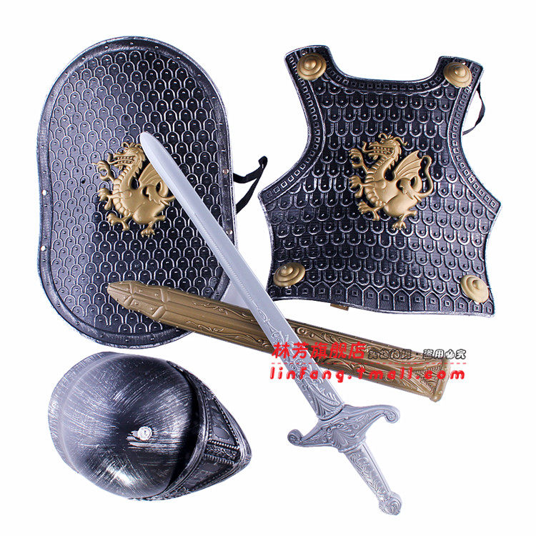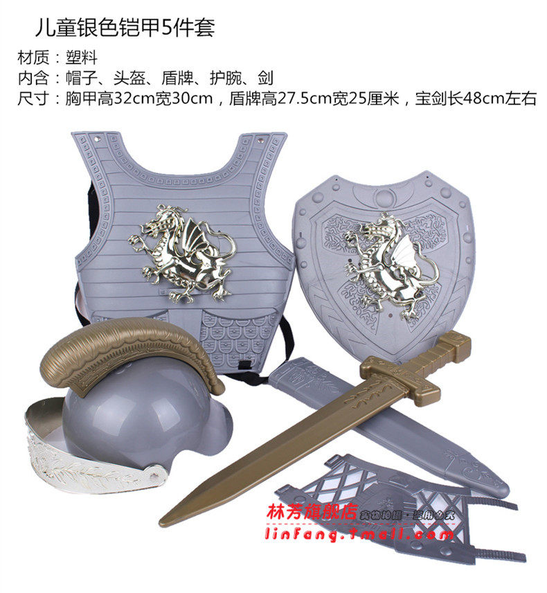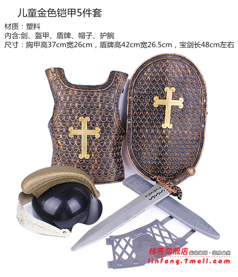 Brand: Lin Fang Name: 4 sets of armor in children Product content: sword armor shield hat Material: plastic Size: 34 cm wide and 29 cm long breastplate, shield 40 cm long 26 cm wide, 58 cm long sword In fact, no matter how old can wear, only small pictures show Daxian, 1.3 meters Note: this clothing helmet for fragile goods, in the express process is very easy to fracture, a little crack is normal, do not affect the use, please carefully consider the buyer before the shoot.