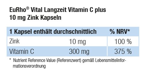 -. Feature : Langzeitversorgt mit Vitamin C über 10 Stunden. / EuRho Vital Langzeit Vitamin C plus 10 mg Zink Kapseln enthalten 300 mg Vitamin C und 10 mg Zink. / Vitamin C und das Spurenelement Zink tragen zur normalen Funktion des Immunsystems und zum Schutz der Zellen vor oxidativen Schäden bei. / Inhalt: 60 Kapseln