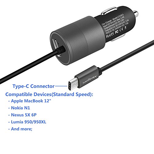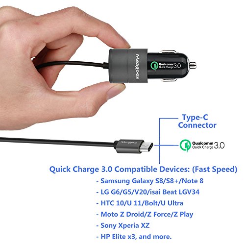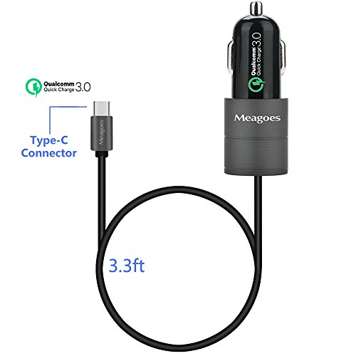 Meagoes Dual Quick Charge 3.0 USB Type C Car Charger Adapter, Built-in 3.3ft USB C Cord, for Samsung Galaxy S8/plus/Note 8, LG V30/V20/G6/G5, HTC 10/U11/Bolt, Moto Z Droid/Force/Z Play and More -Gray