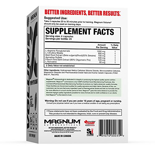 -. Binding : Health and Beauty -. Brand : Magnum -. EAN : 0689076000352 -. Feature : CONCENTRATED FORMULA PROMOTES SUPER, AESTHETICALLY PLEASING PUMPS IN THE GYM - Increases the amount of pump you see and feel when working ou / PUMP PUMP PUMP IT UP WITH OXIDE-MAXIMIZING SUPPLEMENT THAT WOULD MAKE YOUR MUSCLES LOOK ANIMATED - Magnum VOLUME will give you that 3D cartoon muscle look every time you take it. / INCREASES MUSCLES GROWTH IN TARGET AREAS - Blood flow and oxygen transport to working muscles / AIDS AS A GREAT STACK WITH OTHER SUPPLEMENTS INCREASING THEIR EFFECTIVENESS -The absorption and effectiveness of every supplement you take / RUSHES BLOOD INTO YOUR MUSCLE TO INCREASE PUMP AND MUSCLE TISSUE RECOVERY - Your recovery and decrease muscle soreness post workout -. IsAdultProduct : 0 -. Label : Magnum Nutraceuticals -. Manufacturer : Magnum Nutraceuticals -. MPN : 00035 -. PackageQuantity : 1 -. PartNumber : 00035 -. ProductGroup : Health and Beauty -. ProductTypeName : HEALTH_PERSONAL_CARE -. Publisher : Magnum Nutraceuticals -. Studio : Magnum Nutraceuticals -. Title : Magnum Nutraceuticals Volume L-Arginine - 96 Capsules | Increased Energy Support for Amazing Pumps -. UPC : 689076000352