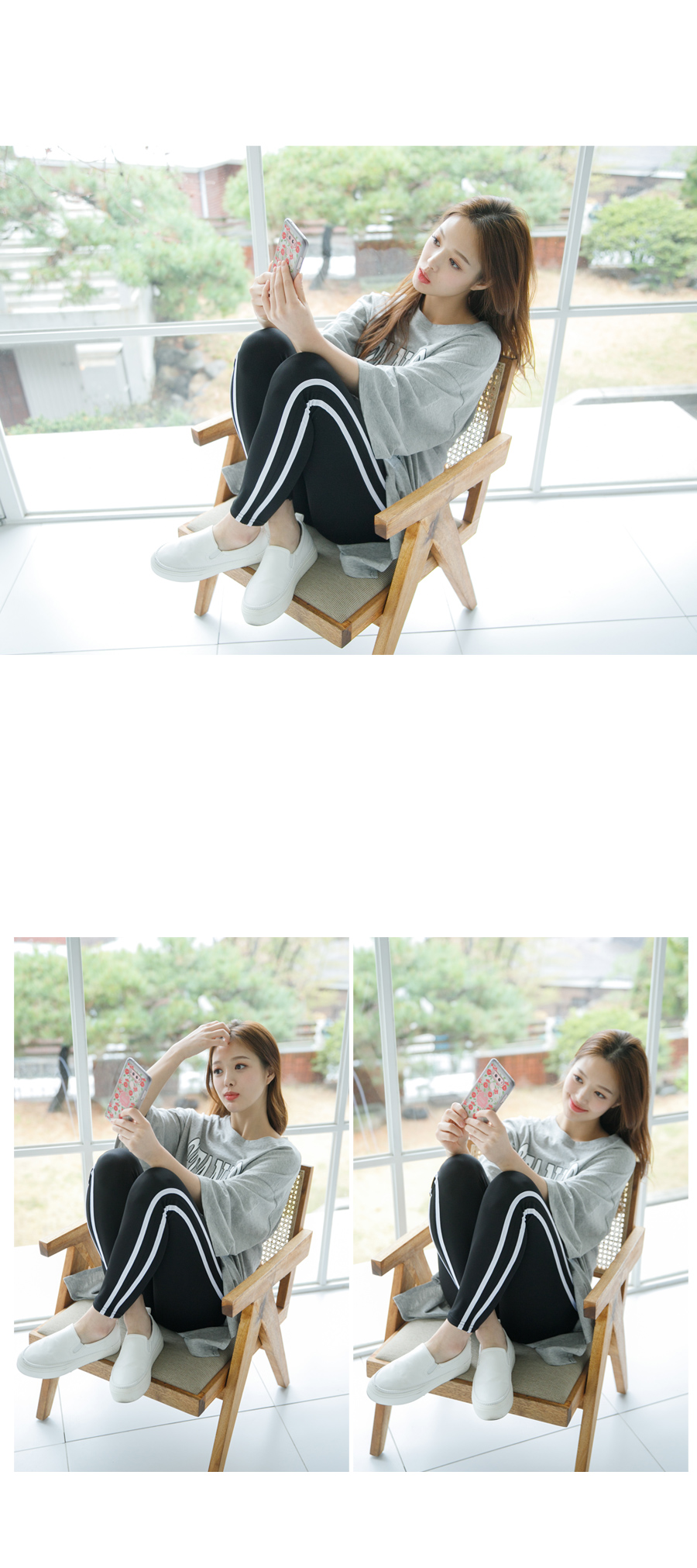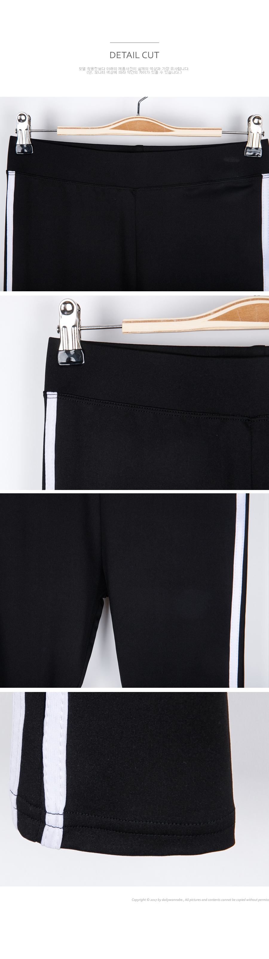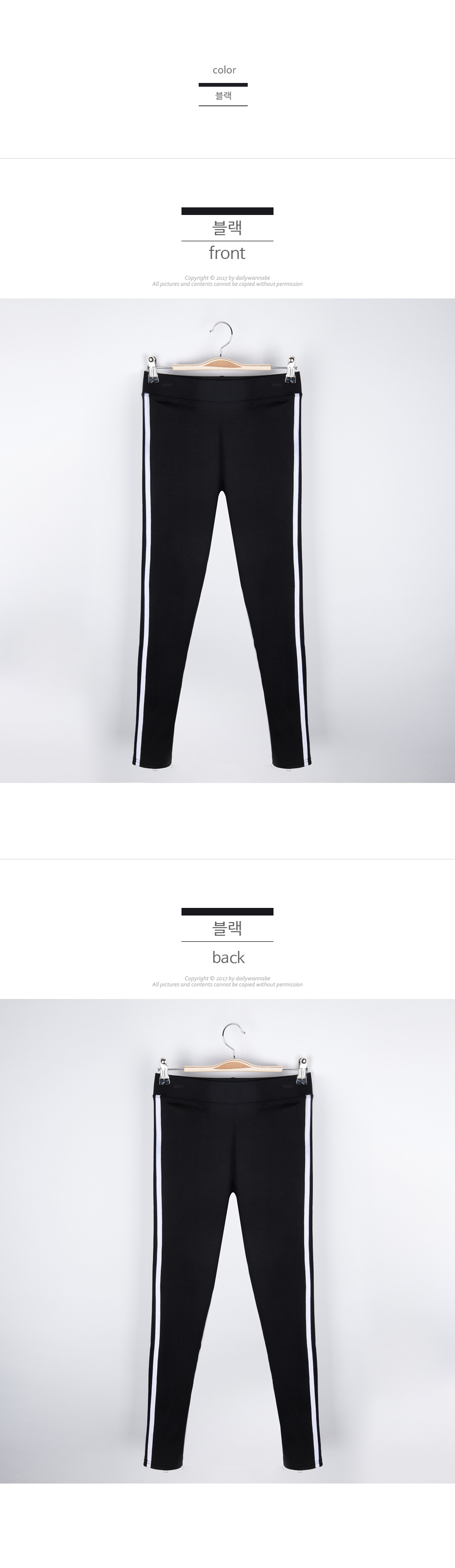 폴리, 스판 혼방소재로 소프트한 터치감은 물론 짱짱한 신축성으로 입은 듯 안 입은 듯 착용감도 정말 편안해요^^ 사이드 라인에 2줄 배색 테잎을 트리밍해주어 레그라인은 날씬해 보이면서 깔끔하게 포인트 되었어요~ 160cm 기준으로 발 끝선정도 오는 길이입니다