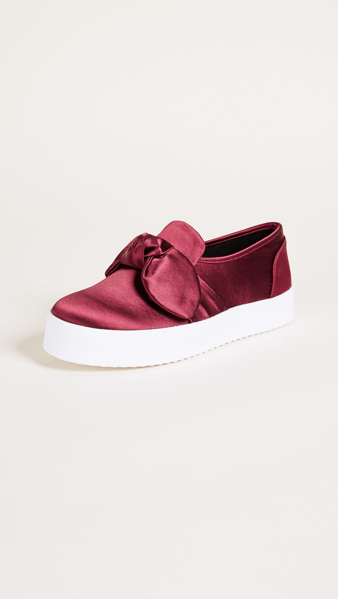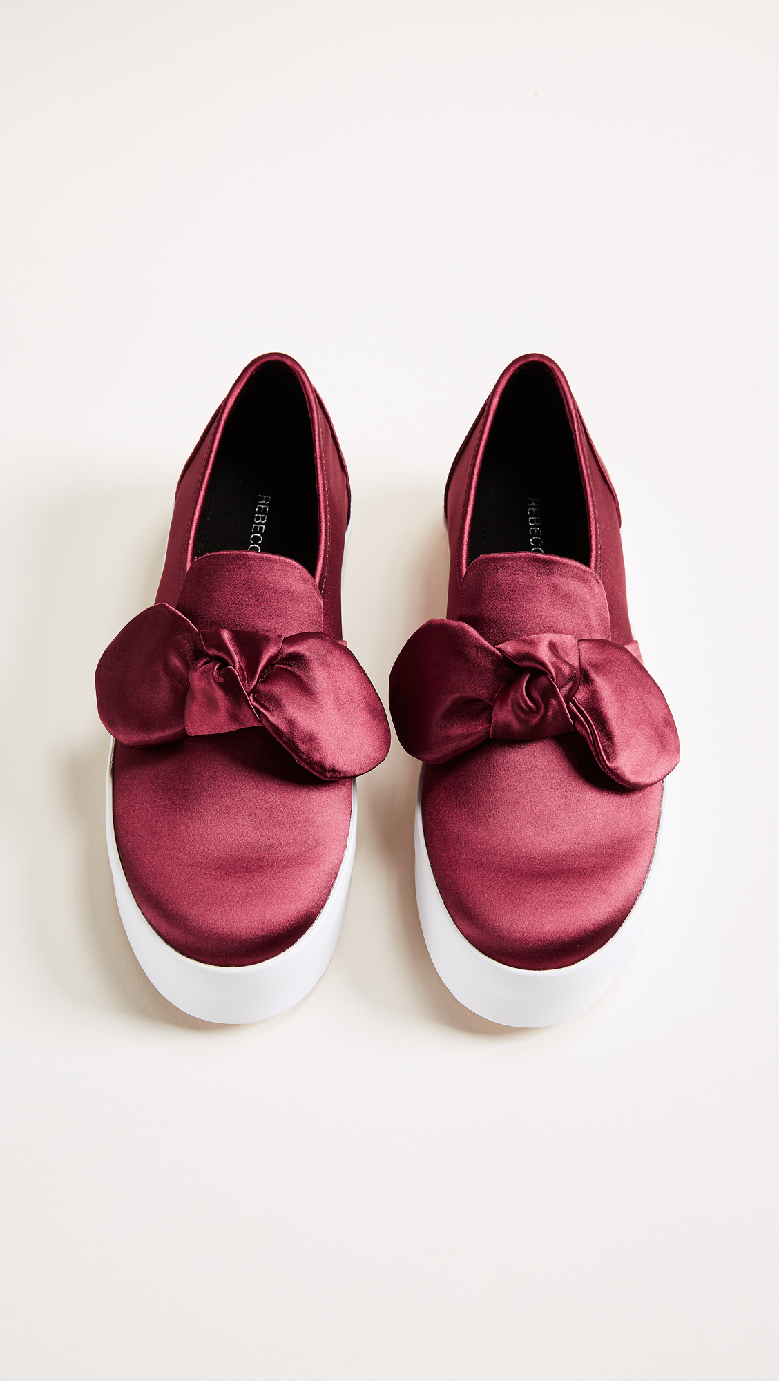 Elegant satin Rebecca Minkoff slip-on sneakers styled with a knotted bow at the vamp. Hidden elastic gore insets. Padded footbed and rubber sole.