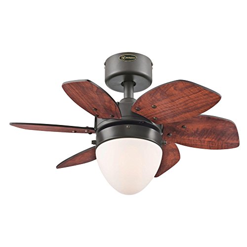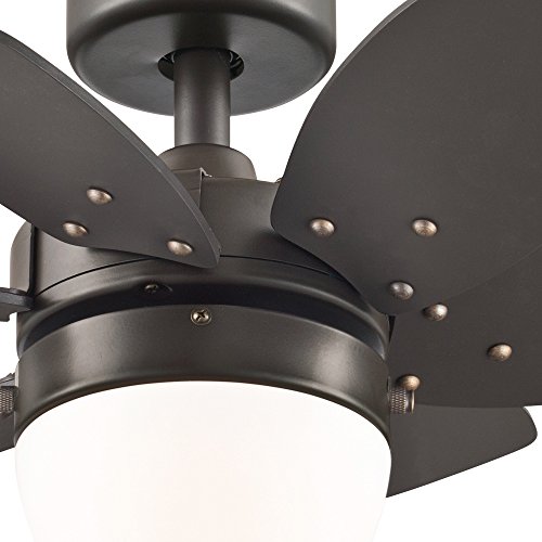 Add a sculptural touch of art to your room with the Westinghouse Origami Single-Light 24-Inch Reversible Six-Blade Indoor Ceiling Fan. The dark espresso finish and oblong opal frosted glass light fixture impart a sleek, sculptural look, while the fan's espresso and applewood reversible blades make it easy to match your decor. Ideal for rooms up to 80 square feet (8 by 10 feet), this fan features a 153-by-9-millimeter silicon steel motor with dual capacitor. Three fan speeds (high/medium/low) and a reversible switch help keep you comfortable. In warm weather, you can run the fan counterclockwise to stay cool. In cold weather, run it clockwise to recirculate warm air from the ceiling, eliminating cold spots and drafts. The Origami is remote control adaptable for added convenience. The fan provides airflow of up to 2,039 cubic feet per minute (cfm). It is rated to operate at 31 watts at high speed (without the lights), which gives it an airflow efficiency rating of 66 cfm per watt. (As a comparison, 36- to 48-inch ceiling fans have airflow efficiencies ranging from approximately 71 to 86 cfm per watt at high speed.) This Westinghouse ceiling fan is backed by a lifetime motor warranty and a two-year warranty on all other parts. Product reference number 72229.Feature