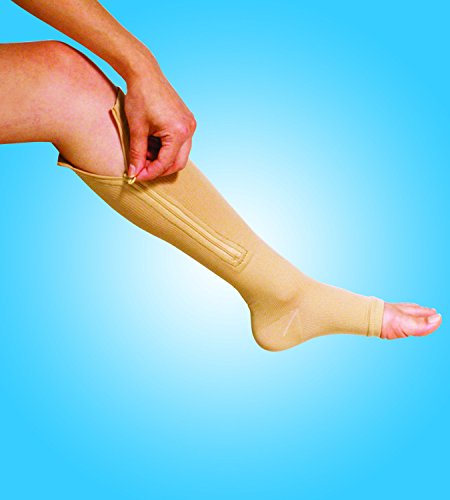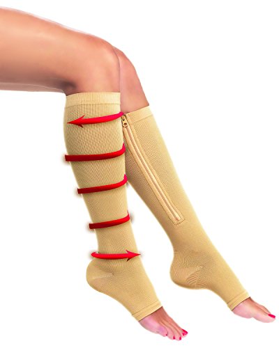 - Feature : Compression stockings alleviate pain by increasing circulation, giving you instant relief from even your worst pain and swelling / Made with a breathable nylon (90%) and spandex blend / Pinch-resistant zipper makes them easy to put on and take off. / Help relieve your symptoms all day, every day. / Design is perfect for long trips
