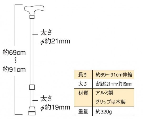 握りやすいグリップで、杖は伸縮式で長さ調節ができます アルミ製で軽くて丈夫です  サイズ 長さ:69~91cm(φ2.1/1.9cm) 個装サイズ:74×15×7cm 重量 320g 個装重量:620g 素材・材質 アルミ、木製グリップ 付属品 取扱説明書 製造国 台湾 歩行・移動におすすめ  握りやすいグリップで、杖は伸縮式で長さ調節ができます アルミ製で軽くて丈夫です