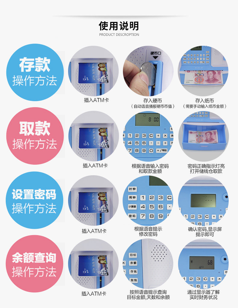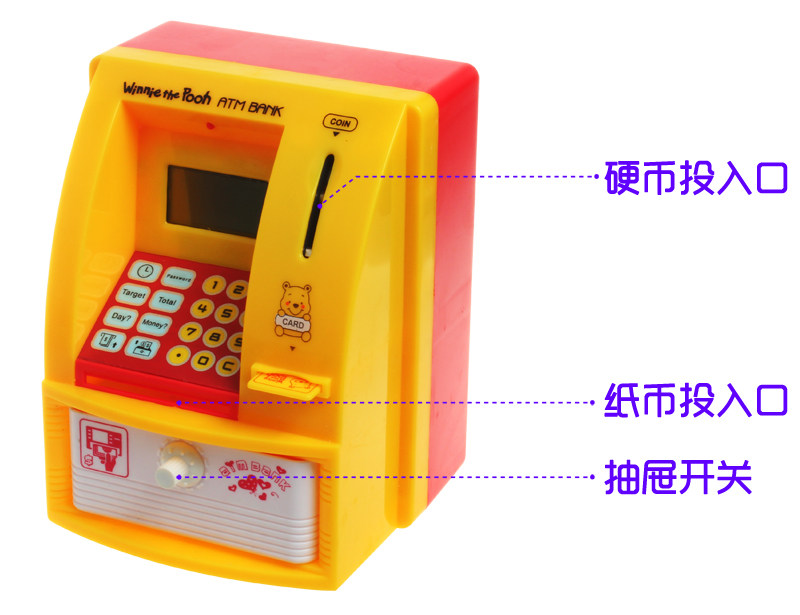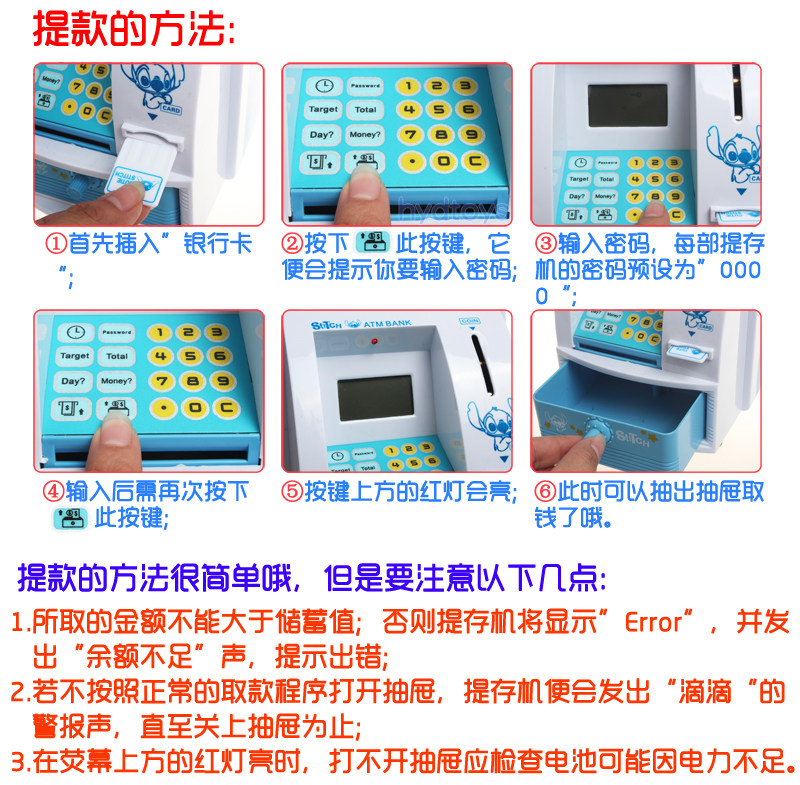 To withdraw money, you need to enter the password card, first press the deposit button in the lower left corner of the deposit button "ATM deposit button" Enter your deposit amount, press the deposit button "ATM deposit button" to confirm At this point there will be a voice prompt: Deposit amount * *yuan. Then press the withdrawal button "ATM withdrawal button" enter the password 0000 and then press the withdrawal button "ATM withdrawal button" prompts for the withdrawal amount (withdrawal amount can not be greater than the amount of the deposit) can open the drawer! (Sounds all the way!)