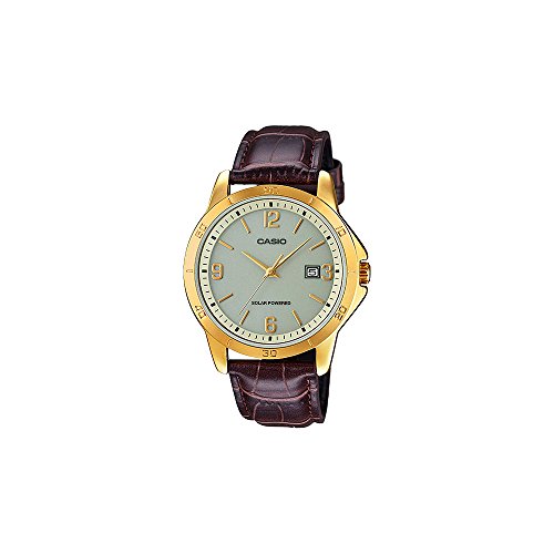 Brand, Seller, or Collection Name:Casio Part Number:MTP-VS02GL-9A Item Shape:Round Dial window material type:Mineral Display Type:Analog Case diameter:42 Case Thickness:10 Band Material:Leather Band length:Men's Standard Band width:18 millimeters Band Color:Brown Dial color:Gold Calendar:Date Special features:n/a Item weight:1.76 Ounces Movement:quartz (Solar) Water resistant depth:30 Meters