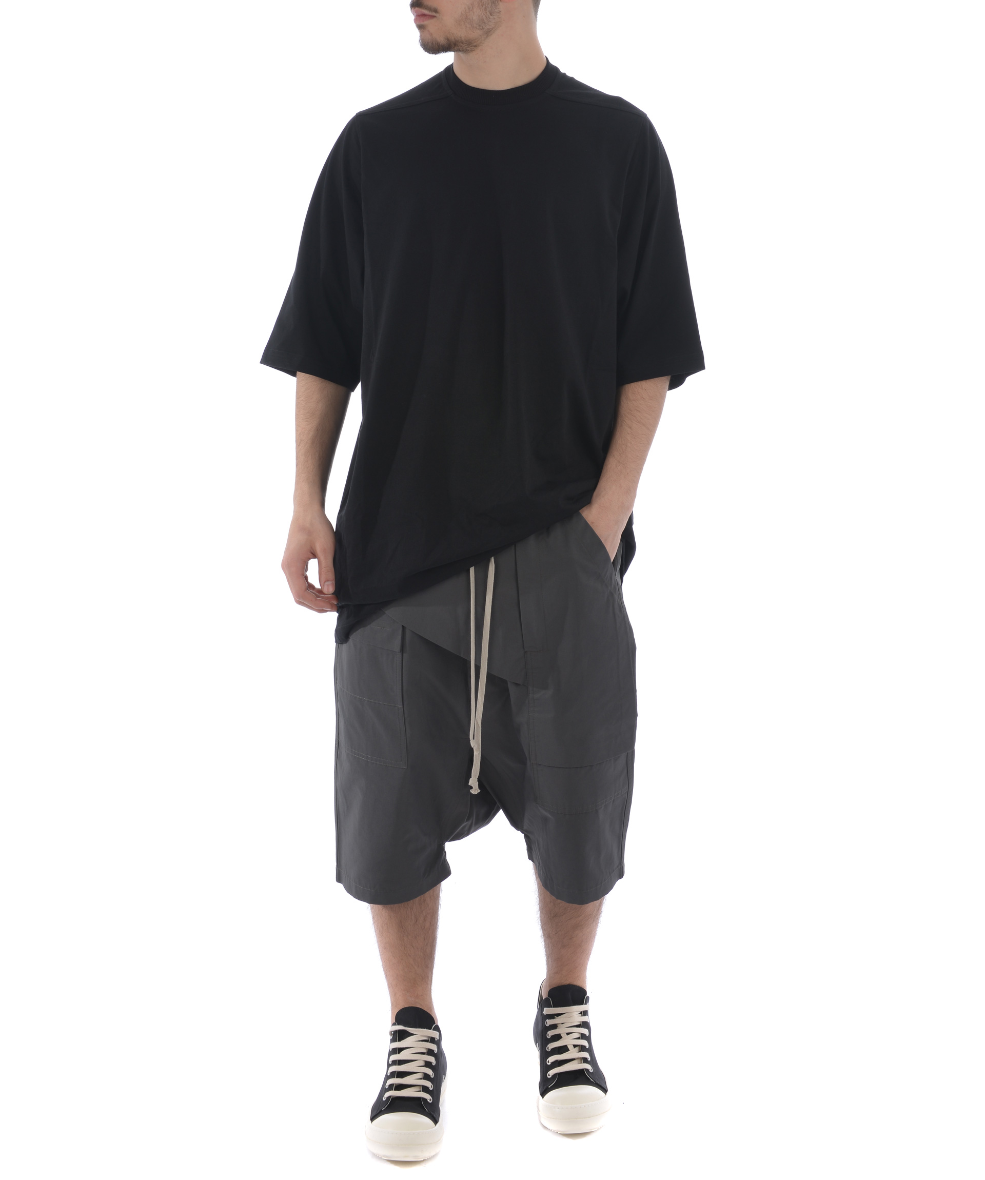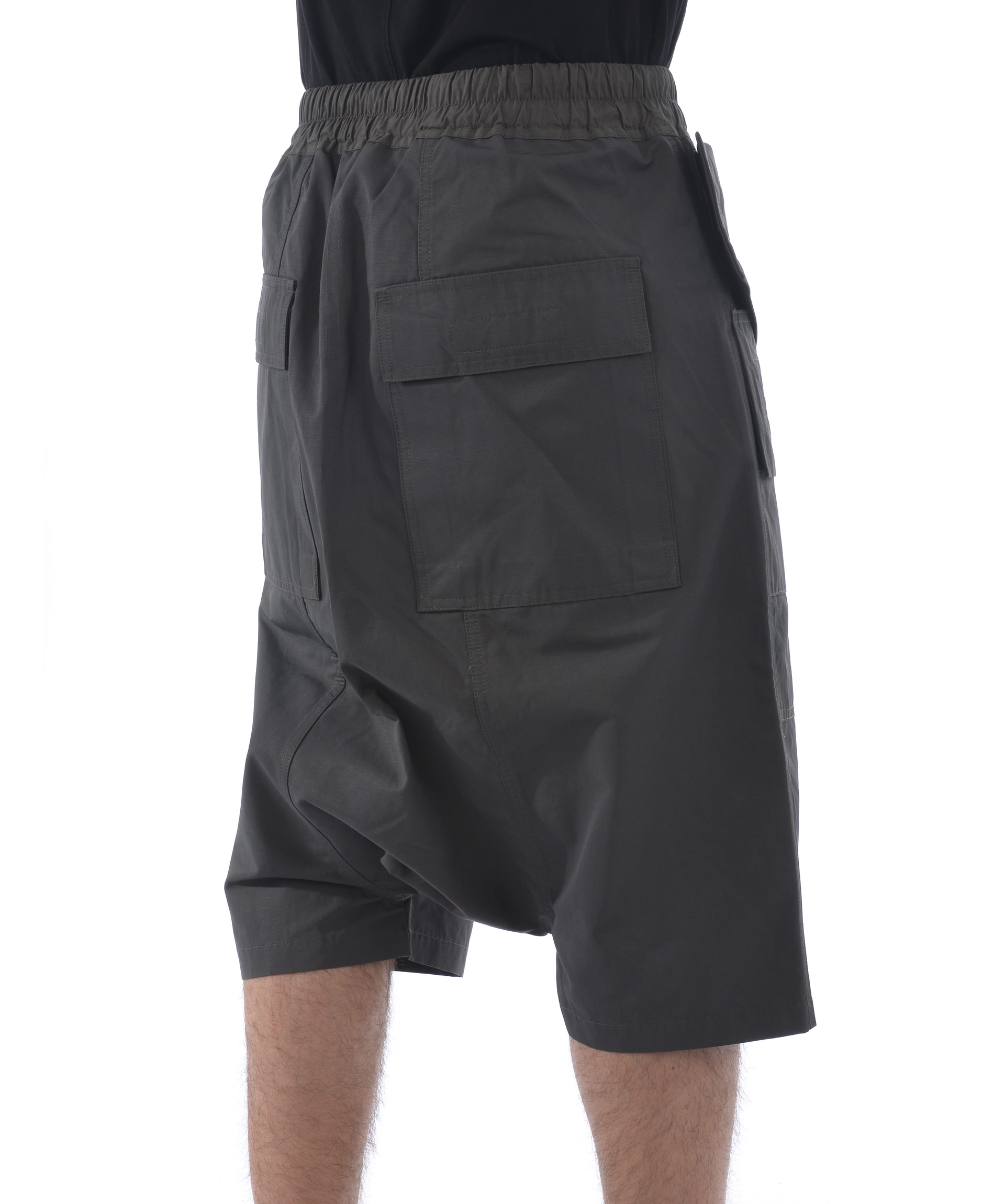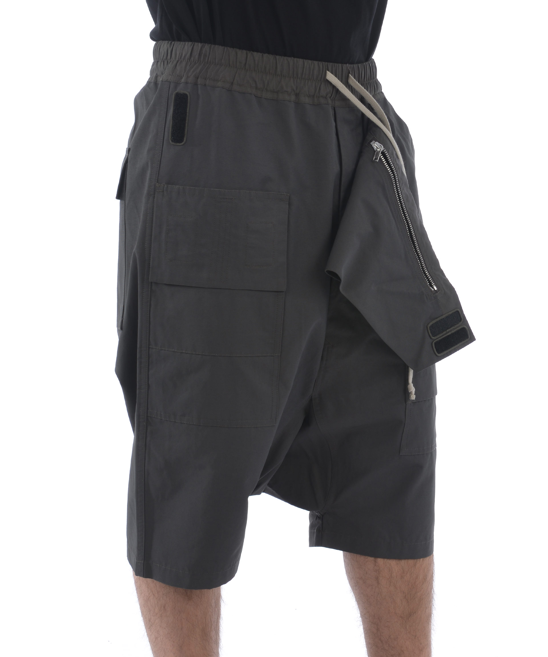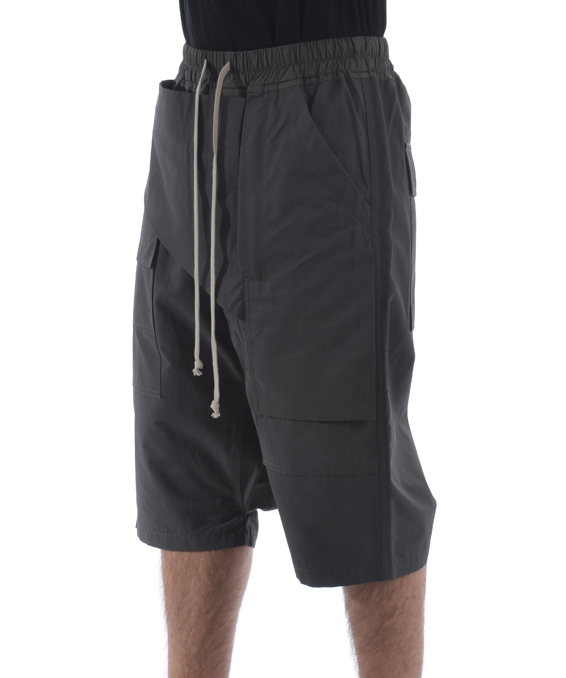 Short cargo DRKSHDW Rick Owens in twill di misto cotone Grigio scuro. Elastico in vita con coulisse. Tasconi frontali e sul retro. Patta frontale effetto marsupio. Cavallo basso. Misura in foto S 52% cotone, 48% poliammide
