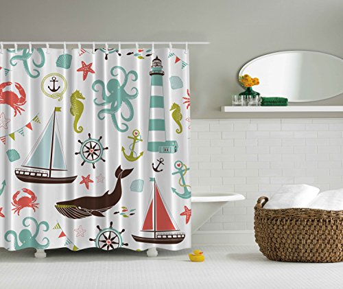 Fabric Shower Curtain by Ambesonne, Whale Shark Seahorse Sea Creatures Rope and Anchor Octopus Coral Crab Marine Lighthouse Ocean Theme Home Decor Bathroom Nautical Coastal, Coral Turquoise Brown