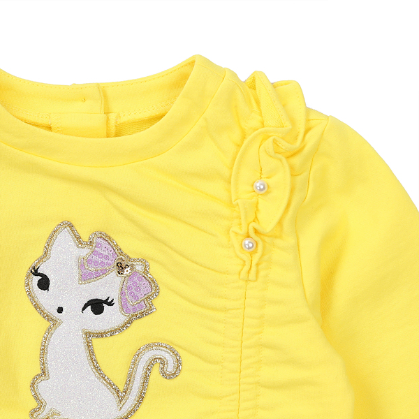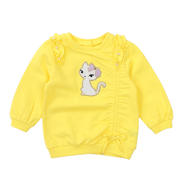 상품설명 옐로 셔링 롱맨투맨입니다. 양쪽 어깨라인에 들어간 프릴과 진주 장식 그리고, 자연스레 셔링지어지는 언밸런스한 끈장식이 트렌디한 스타일입니다.
