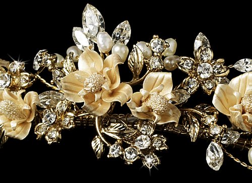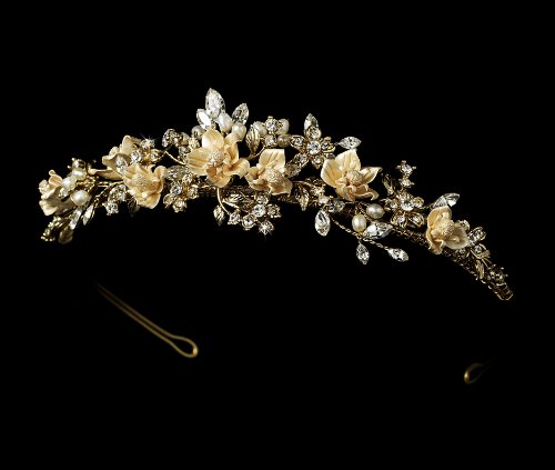 Binding : Misc. Product Description This exquisite floral tiara features stunning gold plating, clusters of creamy freshwater pearls, handcrafted porcelain flowers, and clear rhinestones. The ornamented portion of this piece measures 7-1/2" wide and 1-1/2" tall at its center peak, and the piece ends in two loops that allow you to fasten it in your hair with bobby pins. Perfect for the classic bride. 0