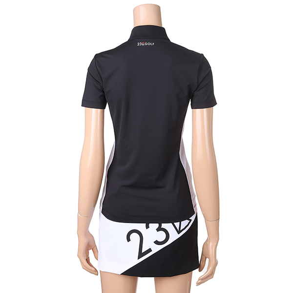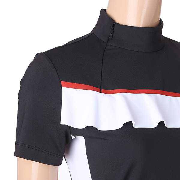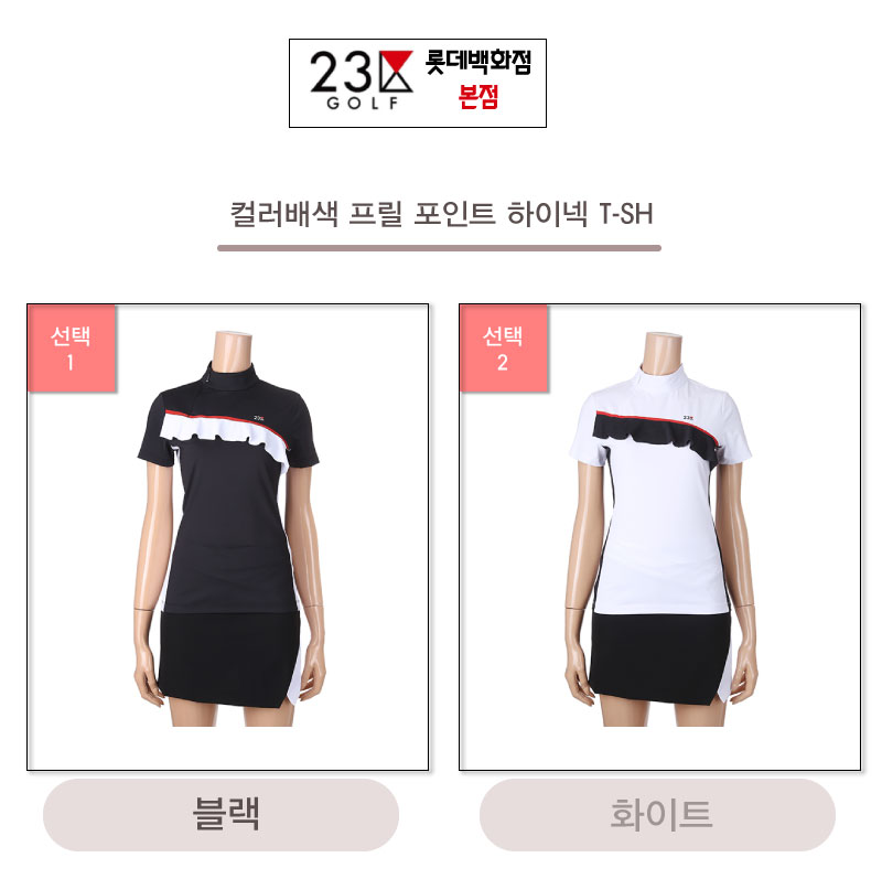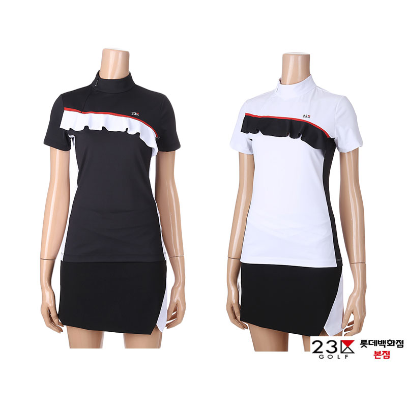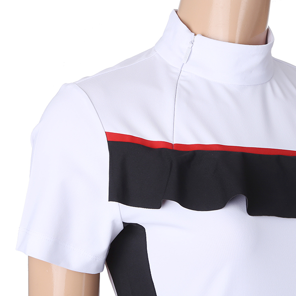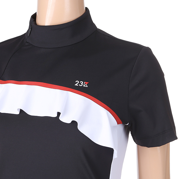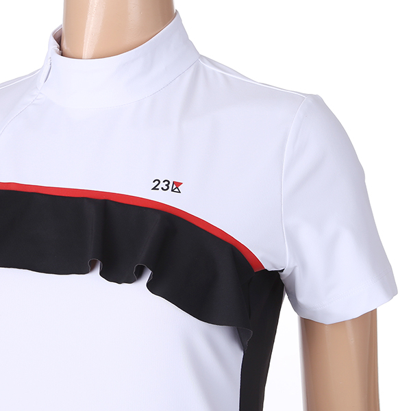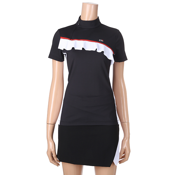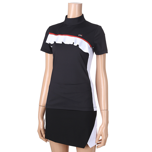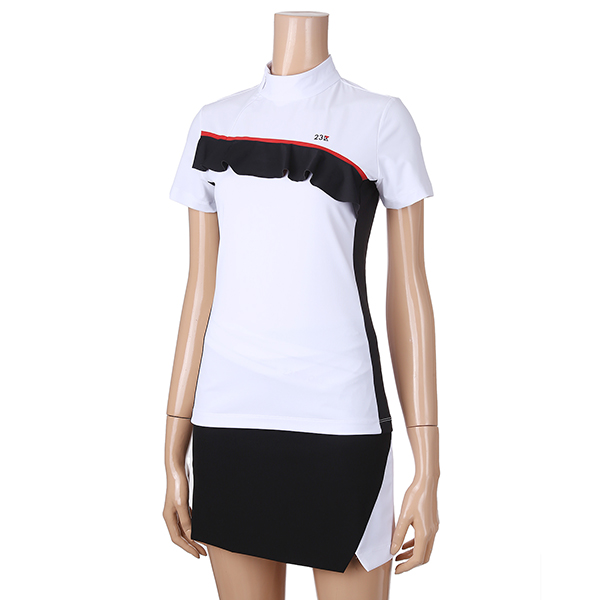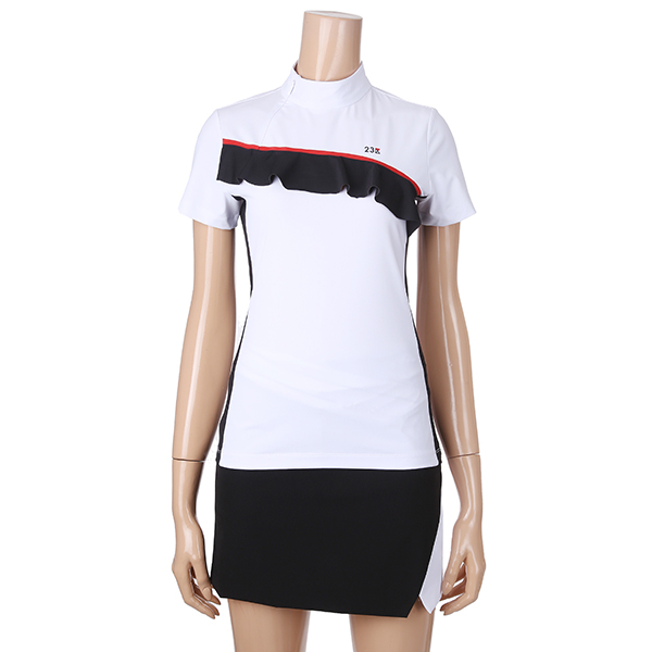 - 앞가슴 부위 컬러배색 프릴 포인트를 준 하이넥 티셔츠.