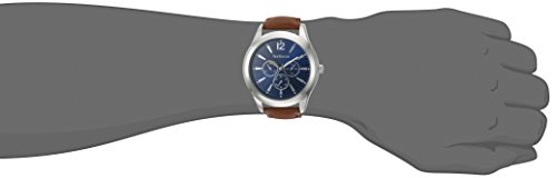 -. Feature : Round watch with blue dial featuring open lugs, trio of non-functional subdials, and fluted crown / 45 mm metal case with glass dial window / Quartz movement with analog display / Brown synthetic band with buckle closure / Water resistant to 50 m (165 ft): In general, suitable for short periods of recreational swimming, but not diving or snorkeling