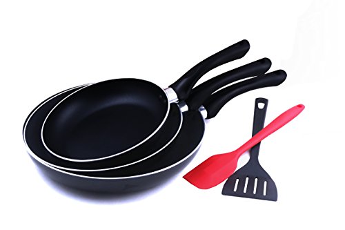 The set consists of 3 Fry Pan along with a Silicon Spatula and Slotted Turner to make it a complete cooking package for any kitchen Frying Pan set is thoughtfully designed with many features, making it ideal for any home. These Non-Stick, PFOA, Lead and Cadmium free frying pans are made using top-rated 3003 Aluminum Alloy with Spiral bottom for even cooking Bakelite handle provides a comfort grip that resists heat and scratching. Material: - Fry Pan: 3003 Aluminum Alloy with Bakelite handles