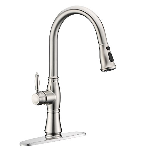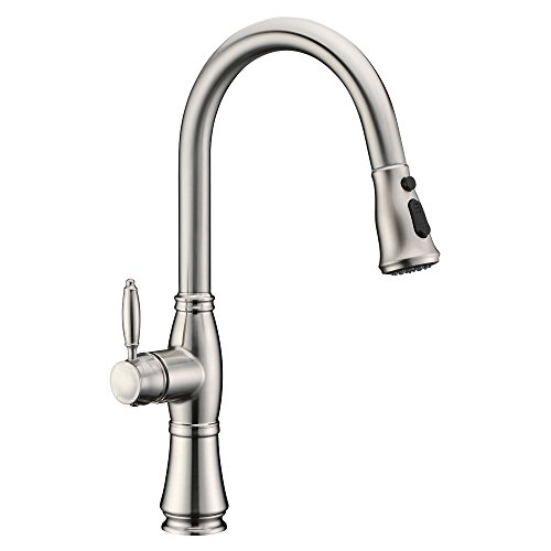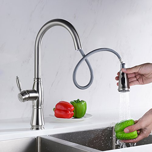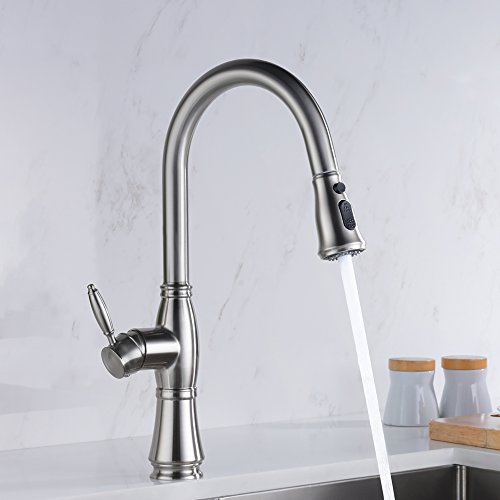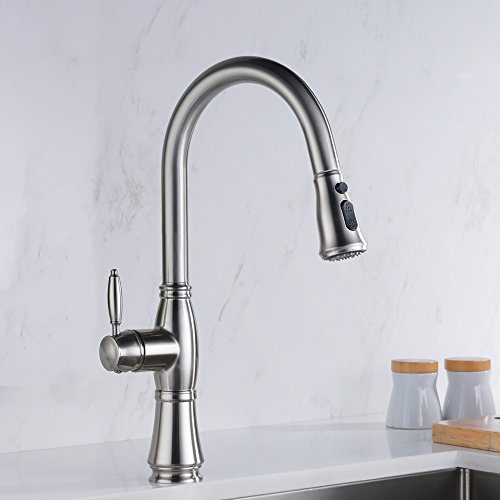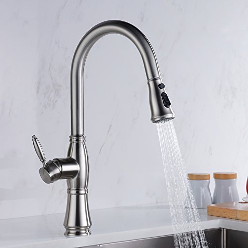 HUASONG Single Handle Pull Out Kitchen Faucet, Pull Down 3 Functional Sprayer Nozzle Pause Function Solid Brass Tall Body Kitchen Sink Faucet, Brushed Nickel