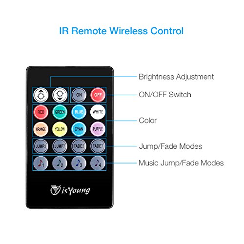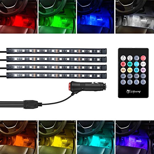 - isYoung Car LED Strip Lights, High quality PVC Rubber; The String Light is Flexible and Water Resistant, IR control RGB strip lights, 4 pcs 48 LED, 8 color optional under solid color mode,makes your car more attractive.