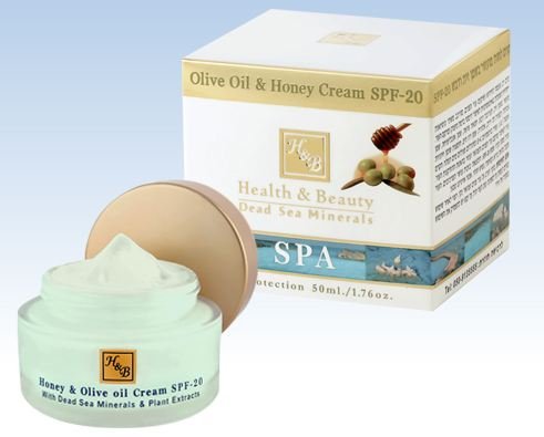 -. Feature : The Olive Oil & Honey Cream SPF-20 is an intensive cream, especially developed for the renewal and rejuvenation of facial skin. Its combination of two unique formulas acts to intensively and dramatically improve the firmness and the texture of your skin, with a natural anti-aging effect. The cream is enriched with Olive oil, a honey blend, Shea butter, Sea Buckthorn, Avocado oil, Green Tea extract, Aloe Vera, Rose Hip oil (which is effective in wrinkles prevention) as well as the essential fatty acids Omega 3 & 6, vitamins A, C and E, and active Dead Sea water minerals. It also includes the UV filter SPF-20 to protect against UVA and UVB rays. Thanks to the cream's rich ingredients, the skin receives a healthy, velvety, flexible and glowing look and a natural anti-aging effect.