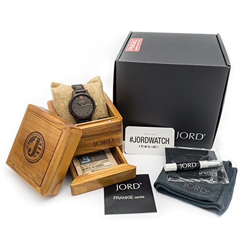 INCLUDED IN PACKAGE -- (1) Frankie Series Wood Watch with gray and rose gold dial set in Dark Sandalwood. (1) Cedar Valet humidor watch box. (1) cleaning cloth (1) JORD Preserve citrus oil cleaning pen (1) instruction booklet and supplementary information (1) micro-fiber glass cleaning cloth (1) Retail JORD shipping box. FULL 1 YEAR FACTORY WARRANTY