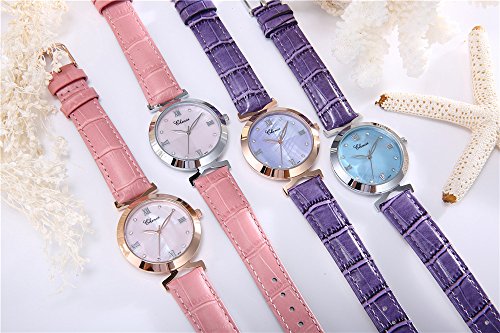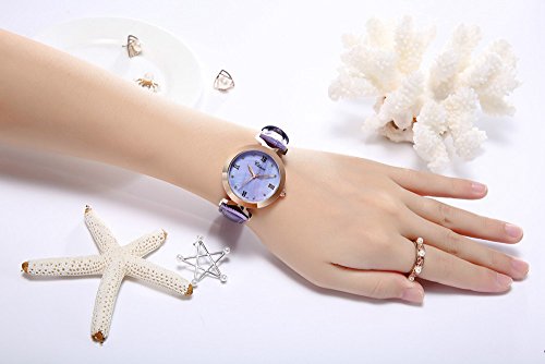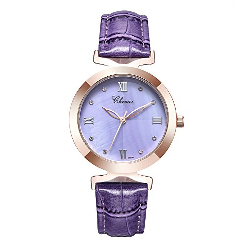 Mineral crystal lens; scratch resistant and durable. Purple mother-of-pearl dial with elegant rhinestone embedded and Roman numeral as hours indicators.