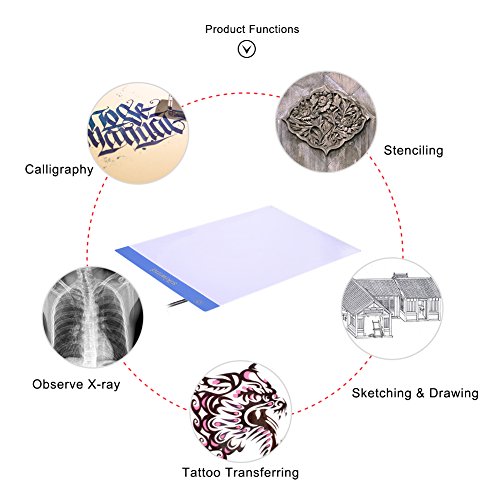 - MUFTI-FUNCTION USE-The tracing light box can be used for 5D DIY diamond painting,sketching&drawing,stenciling,2D animation,calligraphy,embossing,tattoo transferring,stained glass,quilting,appliqué,X-ray viewing etc.