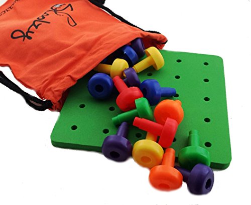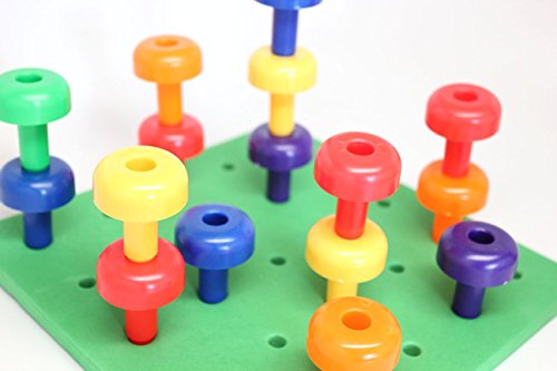 - Feature : 30 Pegs in 6 colors (red, blue, yellow, green, orange and purple)(2"X1.25" each) and Large foam pegboard (8.5" inch square) / Oversize pegs are easy for little fingers to grasp and stack on the peg board and each other to build towers while stacking. / The pegboard stacker set is great for building fine motor skills, hand eye coordination, develop and strengthen visual perception skills, visual motor coordination, making patterns & more! / Use with your child for sorting, color recognition, patterning, learning basic math skills such as counting, adding, subtraction and graphing. The best part about this set is that your little ones won't even notice that they are learning as they "play". / It comes with the Skoolzy drawstring backpack to easily store all the pieces and for your child to carry their peg board set. Makes for quick and easy clean up.