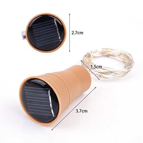 -. Feature : Solar Powered: A solar panel on the top, 100% solar powered, no battery needed, all you have to do is expose the bottle cork to sunlight and let it recharge itself. Generally charge in the sun 5-6h will light up 6-8h (slide the switch to the "ON" position). / DIY fun: Magnificent copper wire with 10 small warm white bulbs, solar powered wine bottle lights can be easily designed to any DIY shape you love. / Easy to Use: Battery compartment is with ON/OFF switch. Easy to turn on and off switch. Our bottle light is easy to fit into the top of the wine bottle. You don't have to worry about drilling a hole in the bottle. Switch on, the warm white luminous points emerge through the bottle, just like the unforgettable fireflies' glow, makes your surroundings romantic and fairy. / Suitable for both indoor and outdoor use, providing you with countless possibilities. Specially for modern Wedding, kids room, bathrooms, dinner table, parties, cafe, showcase, birthdays, holiday, festivals, anniversaries, courtyard, camping and ornamentation. Great gift to children, lovers, family and friends. / We Provide Excellent after-sale Service. 2-Month Return Policy and 12-Month Warranty Service. We are pretty confident about the quality of our Cork Lights that is why it comes with a 12 month warranty.