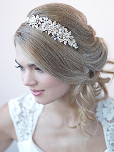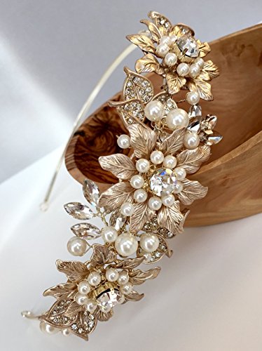 Headband features soft gold-tone leaf blooms and rhinestone encrusted petals along with simulated pearls and sparkling marquis shaped rhinestones