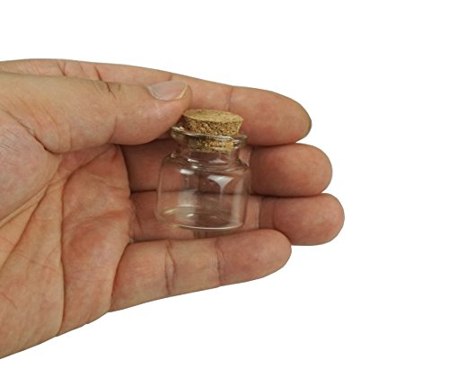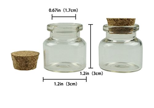 SIZE AND PACKAGE: approx. 1.2 x 1.2 inches ( W x H ). A value pack includes 18 small glass bottles of 10ml with 18 cork stoppers.