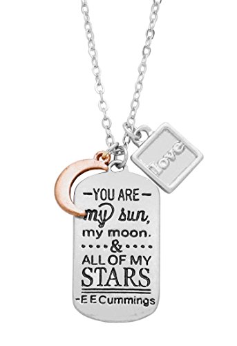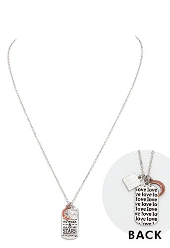 -. Binding : Jewelry -. Brand : Rosemarie Collections -. Department : womens -. Feature : Double sided engraved dog tag style pendant "You are my sun, my moon and all of my STARS" / Accent moon charm in antique rose gold, copper color and "love" charm / Delicate link chain with lobster clasp / Necklace length 16" with 2" chain extension, Pendant 0.5" X 1" / Packaged in a lovely gift box -. Label : Rosemarie Collections -. Manufacturer : Rosemarie Collections -. Model : SW-1138-15XX -. MPN : SW-1138-15XX -. PartNumber : SW-1138-15XX -. ProductGroup : Jewelry -. ProductTypeName : FASHIONNECKLACEBRACELETANKLET -. Publisher : Rosemarie Collections -. Studio : Rosemarie Collections -. Title : Rosemarie Collections Women's "You Are My Sun, My Moon and All of My Stars" Charm Necklace