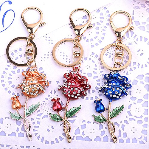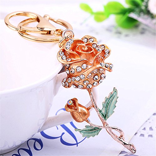 Roses Keychain Sparkling Flower Keyring Crystal Rhinestones Purse Pendant Handbag Charm (Gold)