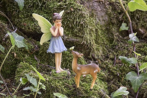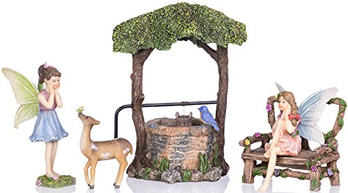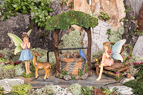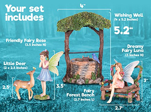 EACH FAIRY PACKED WITH CARE -- Each piece of art is packed in styrofoam and bubble-wrapped. Included in this fairy garden starter kit is: Wishing Well (4x5.2”), Fairy Forest Bench (2.7”), Dreamy Fairy Luna (3”- Seated), Friendly Fairy Rose (3.5”), and Little Deer (2x2.5”).