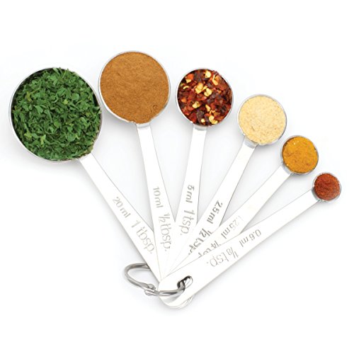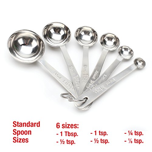 - ★ PREMIUM MEASURING SPOONS ★ Baking great mouth-watering pies, cakes and cookies requires various measurements and these measuring spoons have the variety you demand with 6 (six) of the most common spoon sizes in standard US and metric measurements, lab-tested for accuracy: 1 tablespoon (20 ml), 1/2 Tablespoon (10 ml), 1 teaspoon (5 ml), 1/2 tsp (2.5 ml), 1/4 tsp (1.25 ml) and 1/8 tsp (0.6 ml).