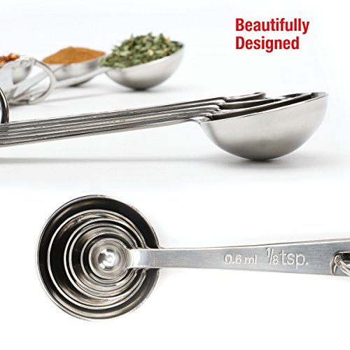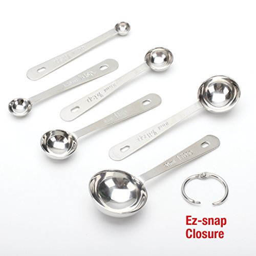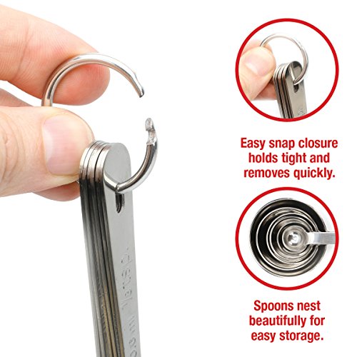 - ★ SAVE TIME IN THE KITCHEN ★ Not only is measuring liquid and dry ingredients (such as salt, pepper, spices, cumin, rosemary, etc.) a breeze, they are quick and easy to clean and dishwasher safe. Also, the EZ-Snap ring lets you quickly separate the spoons for sharing and measuring with accuracy is a breeze. Easy storage, can hang on the ring and they nicely nest together.
