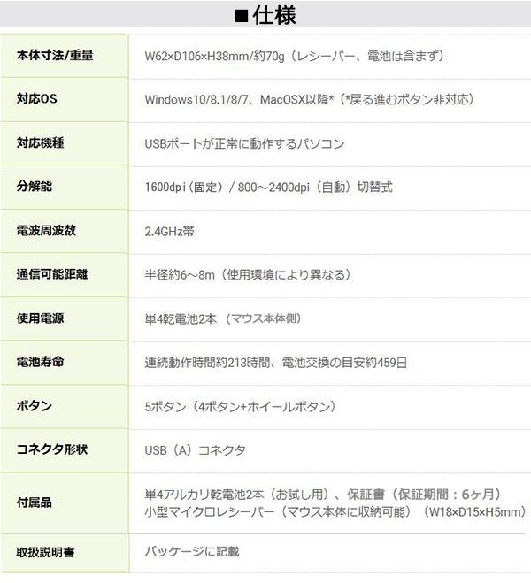 fk094igrjsポインター速度を自動調整するASC(AutoSpeedControl)機能を搭載した、無線タイプのマウスです サイズ 個装サイズ:13×5×22cm 重量 個装重量:150g 生産国 日本 マウスがポインター速度を自動調整 マウスが加速度を検知して、ポインターの速さ(分解能/dpi)を自動的にコントロールするASC(AutoSpeedControl)機能搭載 マウスを素早く動かすとポインターは大きく、ゆっくり動かすと小さく動いてくれるので素早い画面移動と繊細な作業の両立が可能※固定速度モードへ切替えることも可能 BlueLEDセンサー搭載 ポインター速度を自動調整するASC(AutoSpeedControl)機能を搭載した、無線タイプのマウスです