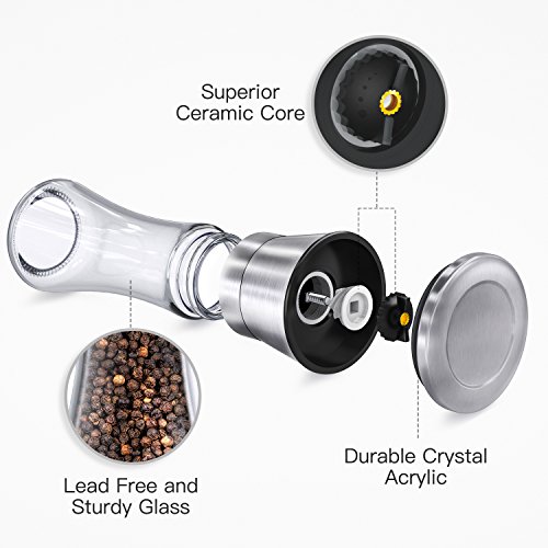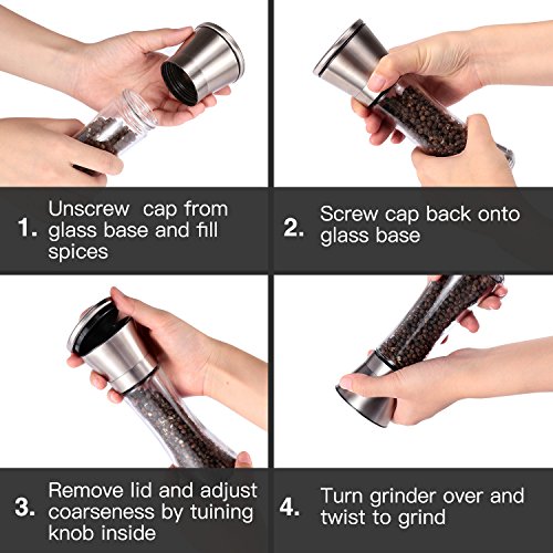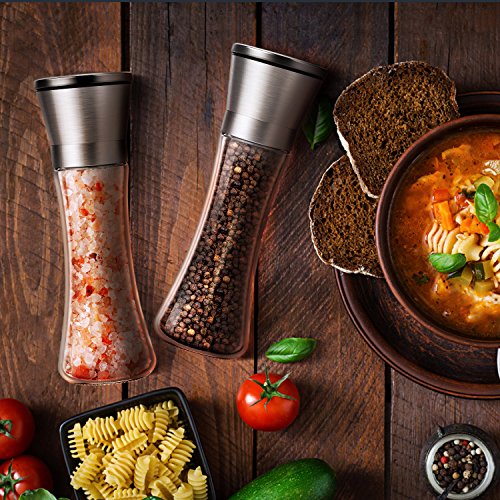 - Modern Design : Our salt and pepper grinder set made of heavy glass and brushed stainless steel with simple and fashion, clean lines, classic design will perform in the kitchen and look elegant on your dining table and charm your family and guests.