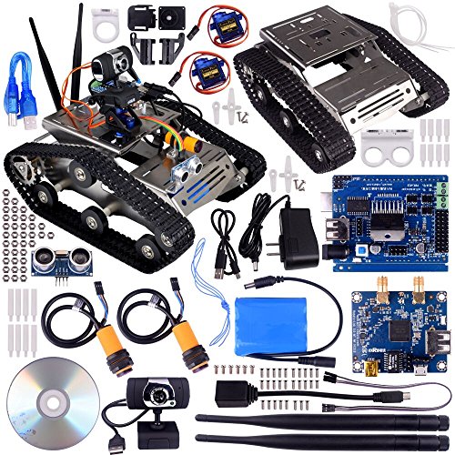 -. Feature : GREAT CHOICE - this Kit is a great choice for learning robotics electronics and Arduino programming It contains mechanical parts and electronic modules for you to start exploring the robot world it can be used to build a robot tank or a 5 wheel robot car This is WIFI version / Smart Car chassis ,Extra-large size stainless steel car body, military crawler-type Robot car. / 2.1KG Chassis with all-stainless, laser-carving and welding body , which is best collection for Intelligent robot fans. / Power system: Double dc gear motors, planetary gear box,12W.1.5W, Degree of climbing:57° / 5 pairs of driven wheels, one pair of capstan , motor specification: 12V 350 rev / min.