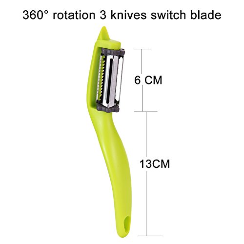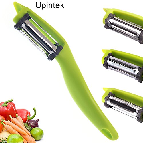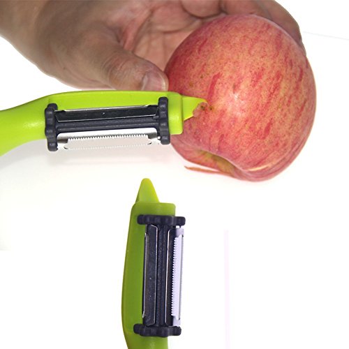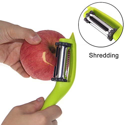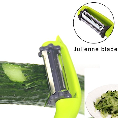 3 PEELS IN 1 -Peeling ,Slicing and Shredding. This ultra sharp, dual-bladed peeler juliennes everything from apples and pears to carrots, cucumbers, potatoes, squash and zucchini with ease and efficiency