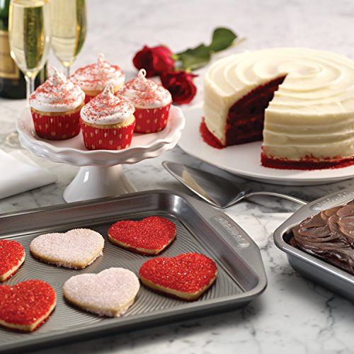 Kiss stuck-on cookies goodbye and say hello to exceptional food release and easy cleanup with the Circulon Nonstick Bakeware 10-Inch x 15-Inch Cookie Pan. With this innovative baking pan, even low-fat almond biscotti and apricot shortbread cookies slide easily from the nonstick surface. Heavy-duty carbon steel construction provides uniform heat distribution, and rolled pan edges on the cookie pan offer extra strength and long-lasting warp resistance. And the TOTAL' Food Release System combines raised circles with PFOA-free premium nonstick for a baking surface that reduces abrasion and is metal utensil safe and easy to clean with exceptional performance. This cookie pan is ideal for baking free-form tarts as well as roasting vegetables. Wide handles provide a confident grip, and the pan is oven safe to 450°F. Combine this cookie pan with other items from the complete Circulon collection to enhance your healthy baking solutions. The results are in ' and out ' of the pan with easy, trouble-free baking and the innovative, efficient Circulon Nonstick Bakeware 10-Inch x 15-Inch Cookie Pan.Feature