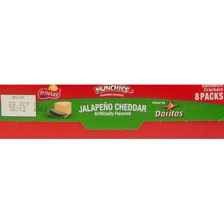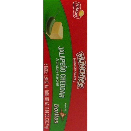 -. Feature : Satisfy all your snack-related cravings in one shot with the Munchies Jalapeno Cheddar Sandwich cracker. / This spicy blend features a combo of jalapeno cheddar filling on Golden Toast crackers. / Bite sized crackers with bold flavors, Munchies deliver serious snacking satisfaction every time. / With their unique texture and unmistakably delicious Doritos cheese flavor, Munchies jalapeno cheddar cheese flavored snack crackers are sure to please cheese lovers everywhere.