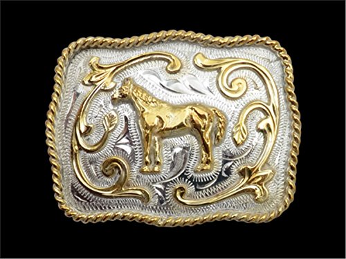 Product DescriptionSilver tone square buckle with gold tone rope edge, horse motif floral design0