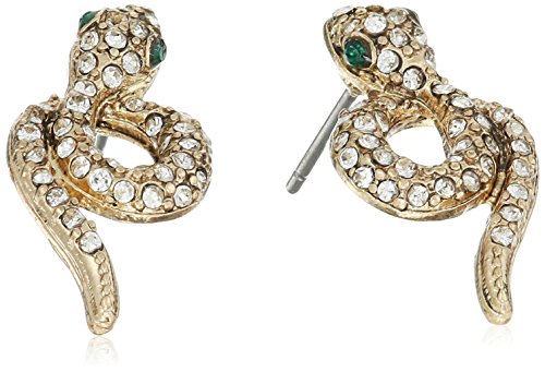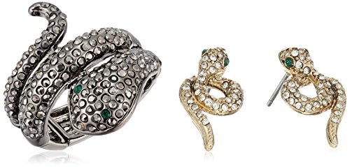 Hematite tone snake wrap ring with pave crystal accents and stretch ring shank and snake wrap studs with pave crystal accents and gold tone details, set includes stretch ring and pair of stud earrings