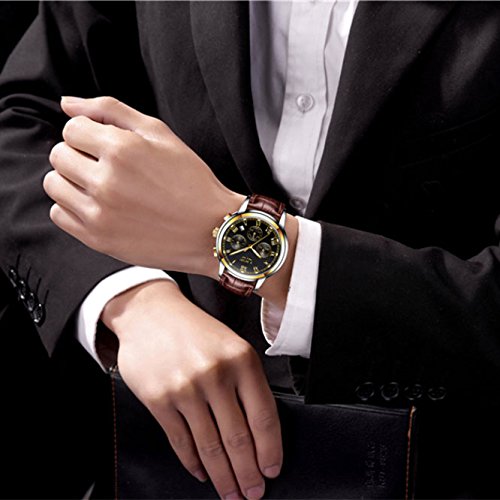 -. Feature : Round watch dial roman number time mark with multi-function sub-dials, dress/business watch, a great gift for family or friends. / leather watchband and alloy case with Push Button Hidden Clasp, no any hurt of your clothes or hands / High quality Japanese quartz movement with analog display, provide precise time keeping. / WATERPROOF for 30M: Hand Wash, Rain Day, Sweating, NO Problem. In general, withstands splashes or brief immersion in water, but not suitable for swimming. (Please DONOT PULL OUT the button under water) / Luxury simple design watch, perfect gift with cleaning cloth for men