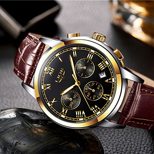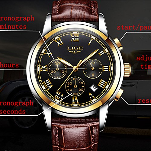 -. Title : Men Leather Strap Watches Men's Chronograph Waterproof Sport Date Quartz Wrist watch Black gold