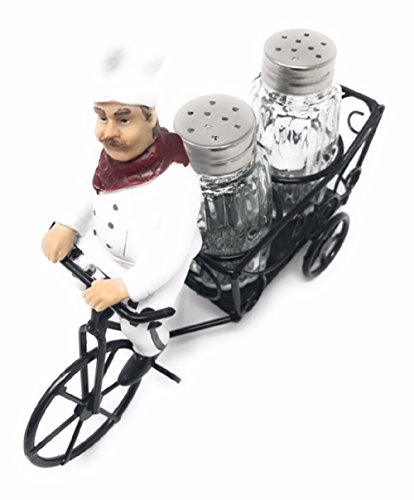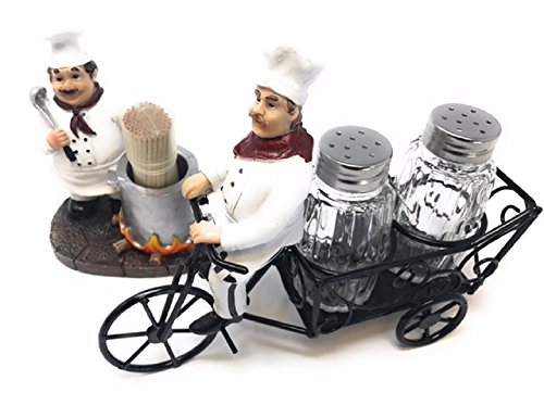 Bicycle Riding French Chef Salt/Pepper Shakers and Toothpick Holder Bundle